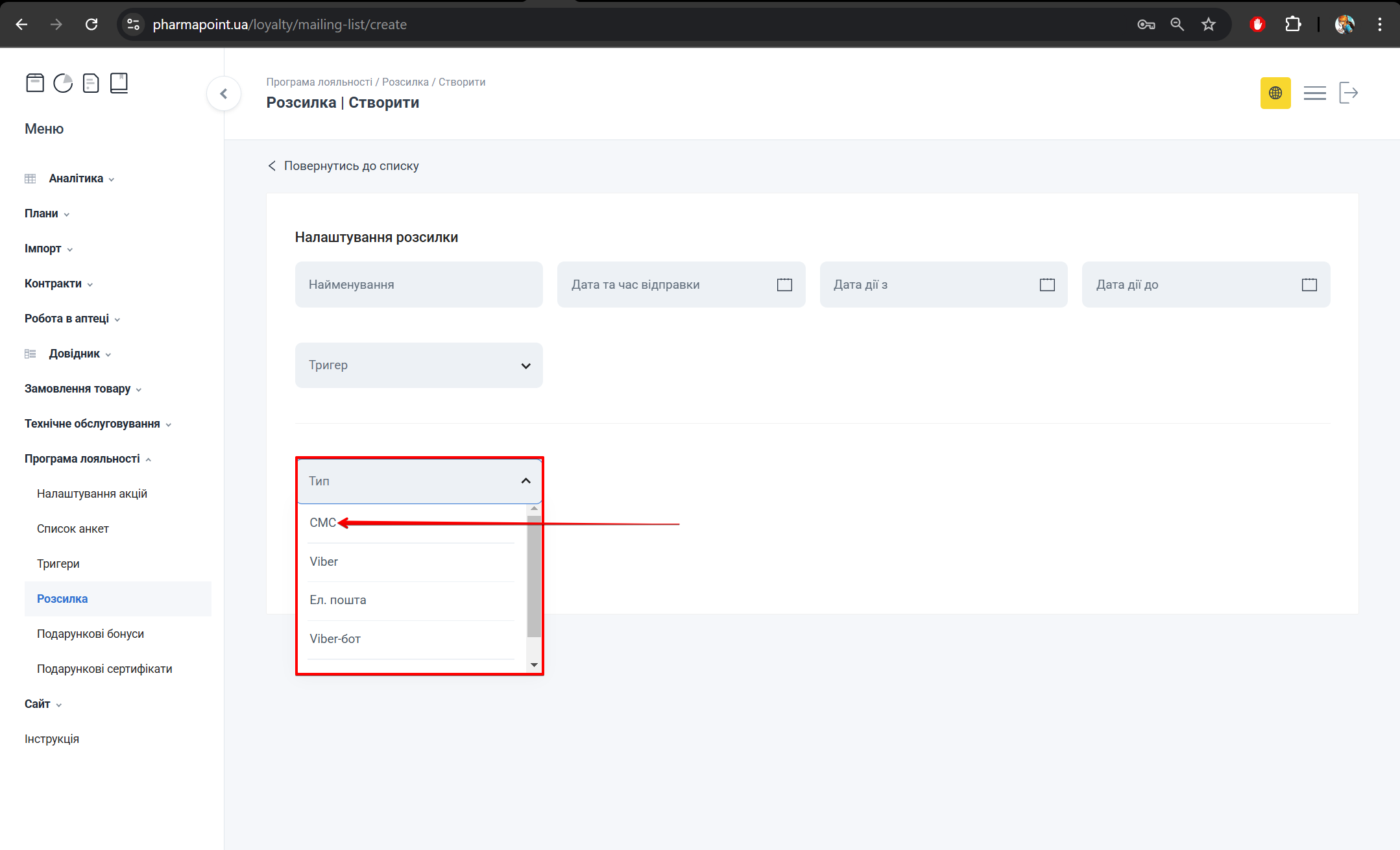 Для переходу в розділ в боковому меню виберіть Програма лояльності → Розсилка.